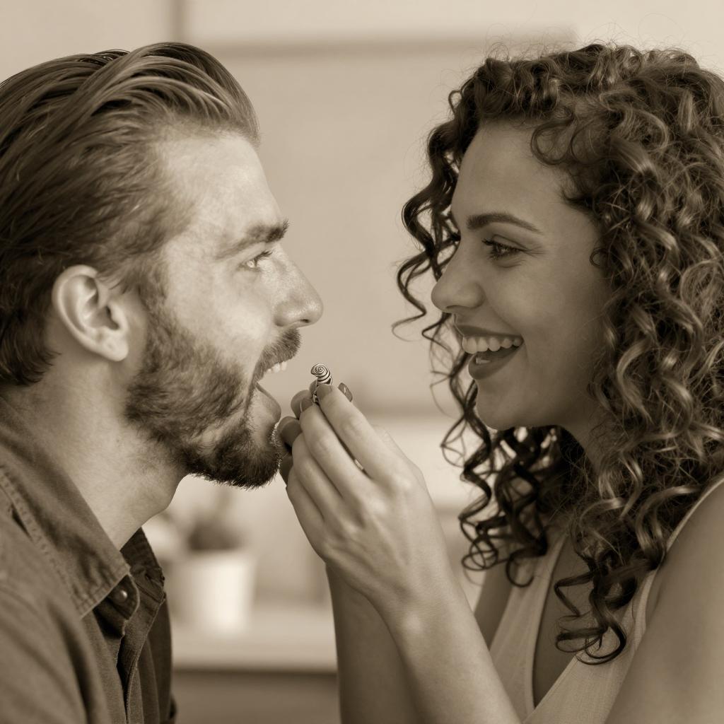 A man and woman. The man has light skin, short dark hair, and wears a white shirt with a black tie. The woman has light skin, curly dark hair with a small hair accessory, and smiles. They are facing each other with intense eye contact. The woman's face is on the left, the man's on the right.