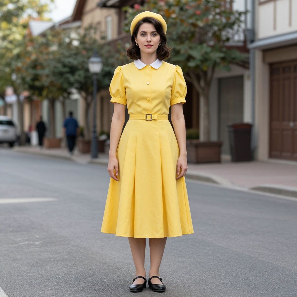 Wilma Flintstones Dress Costume, woman in a yellow dress standing on a street