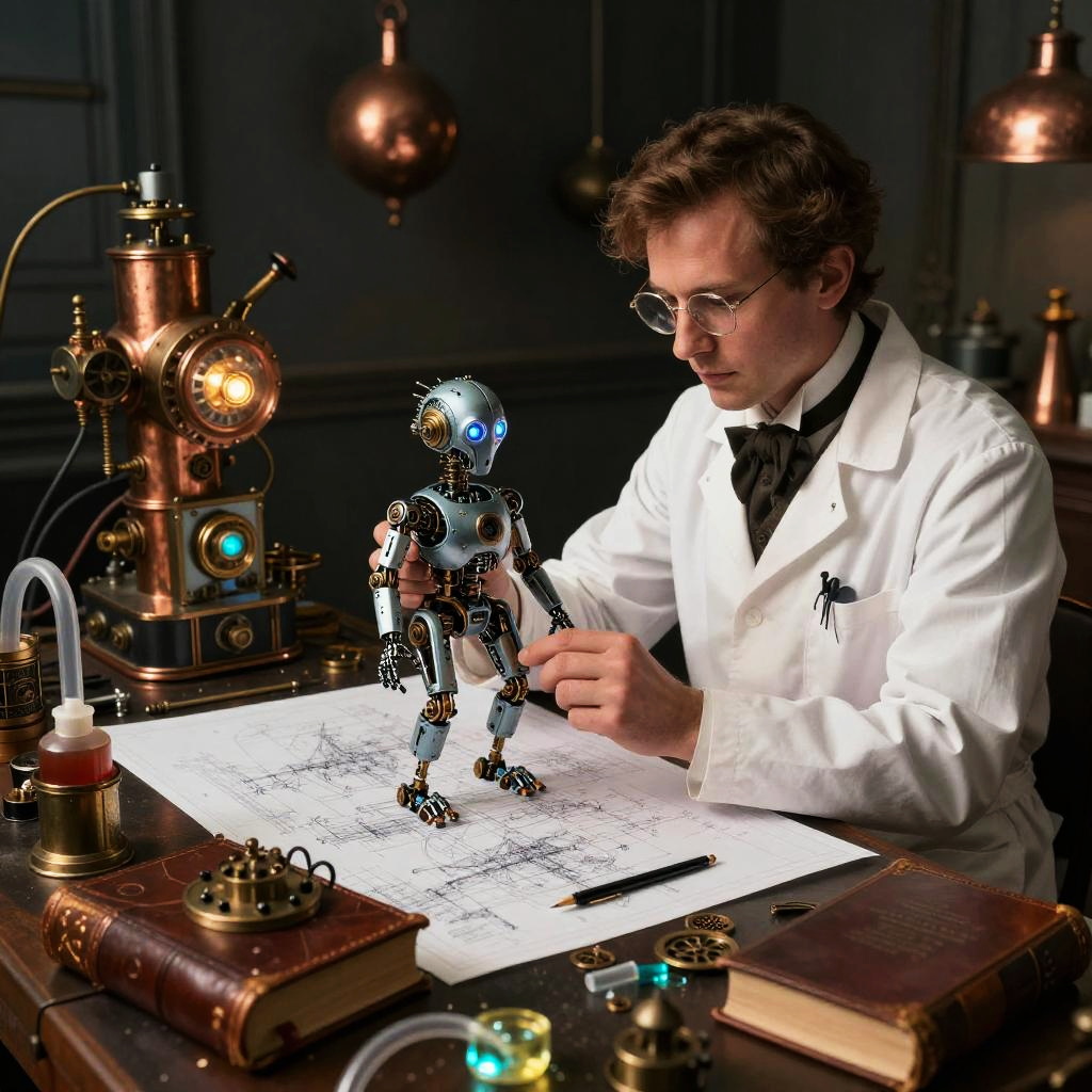 Steampunk doctor examining a robotic creature, surrounded by blueprints and blinking steampunk equipment, vintage leather-bound books and tubes of glowing chemicals scattered across a workshop table, in a dimly lit room with copper and iron decor.
