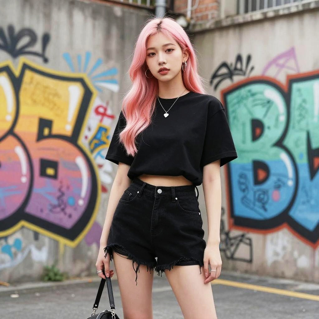 E girl photo, vibrant neon lighting, edgy fashion with pastel hair, urban street background, confident pose, cyberpunk aesthetic, high resolution, cinematic lighting