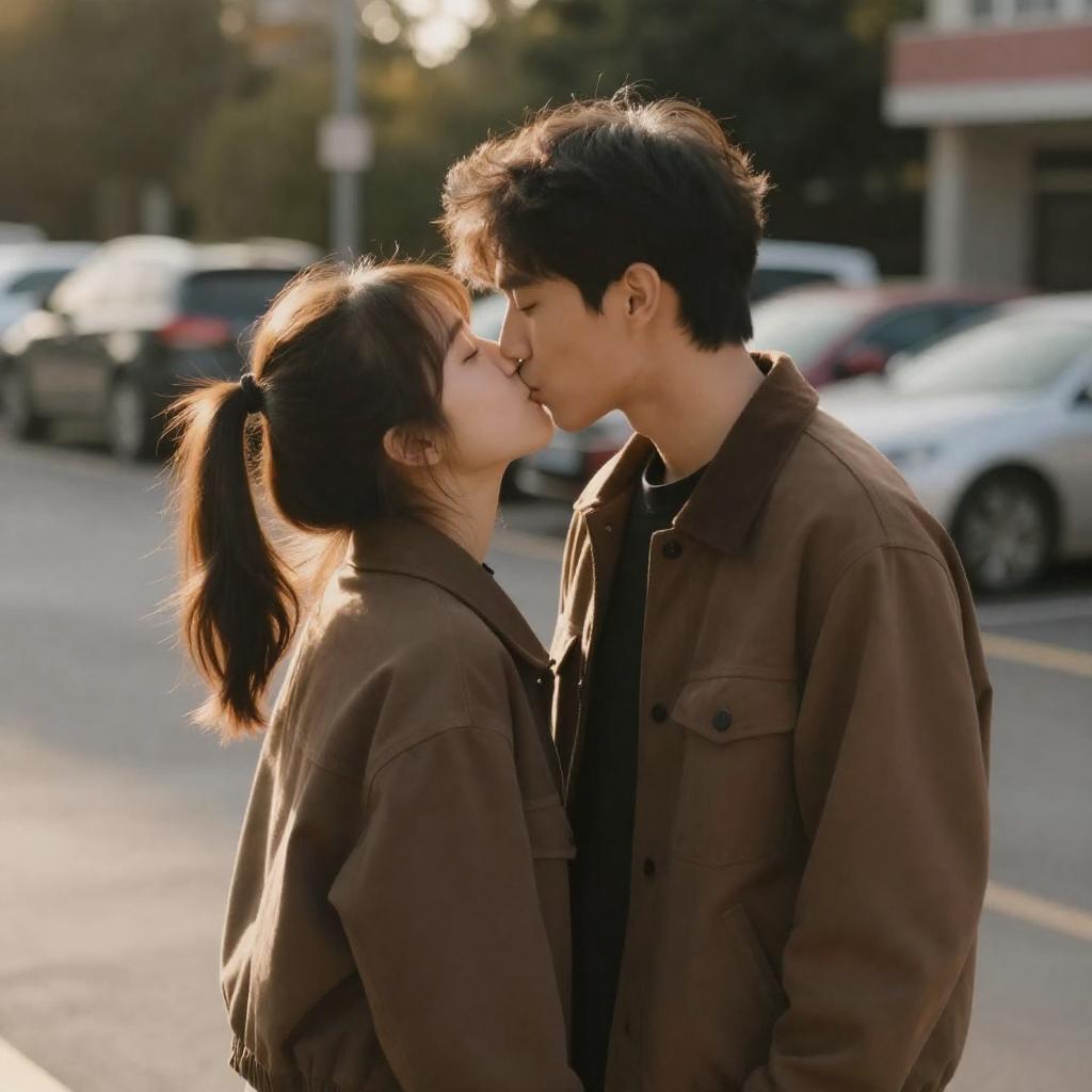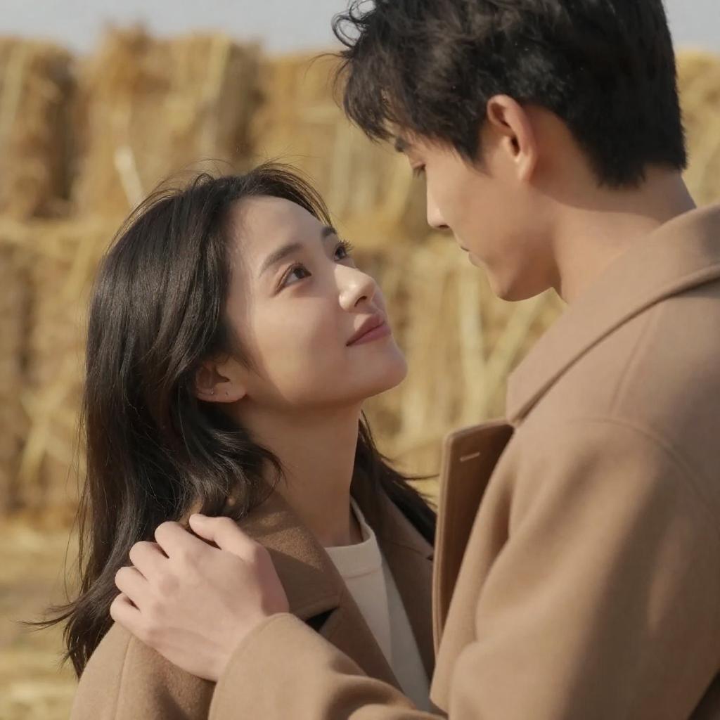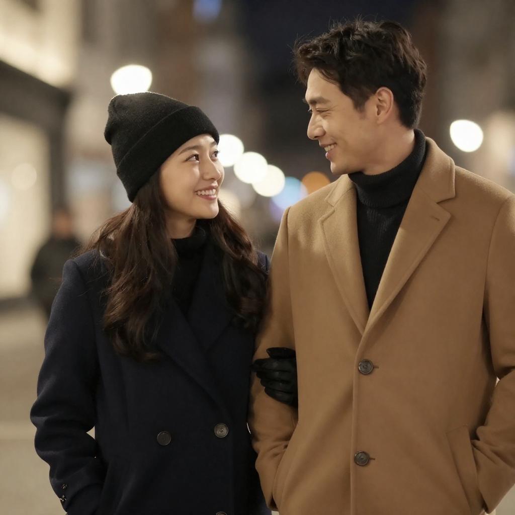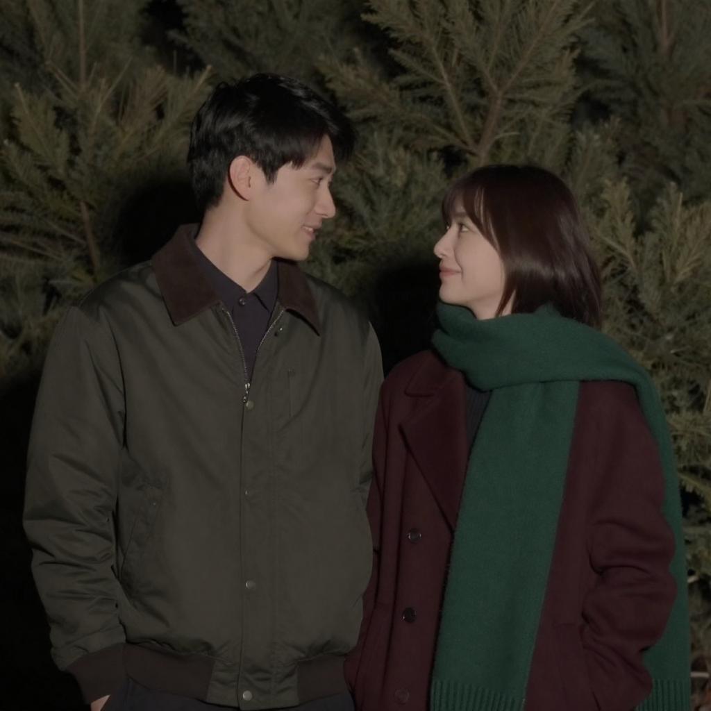 Photograph of a couple standing on a snowy ground at dusk, holding hands. The woman, with shoulder-length brown hair, wears a brown coat and white boots. The man, with short brown hair, wears a green jacket and dark pants. They face a darkening blue sky with silhouetted trees in the background.
