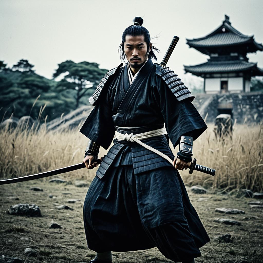 A beautiful male samurai ghost popping out of an ancient battlefield.