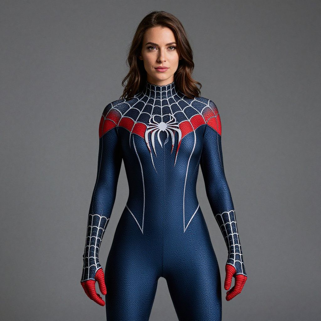"Spider Woman Outfit, a woman in a spider - man suit poses for a photo"