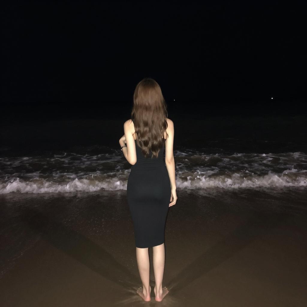 Photograph of a young woman with long brown hair, wearing a black sleeveless top and knee-length skirt, standing barefoot on a dark, wet beach at night. She is facing away from the camera, with waves in the background. The sky is completely black. Her left arm is bent at the elbow, and her right arm is down by her side. A small, distant light source is visible on the right side of the image.
