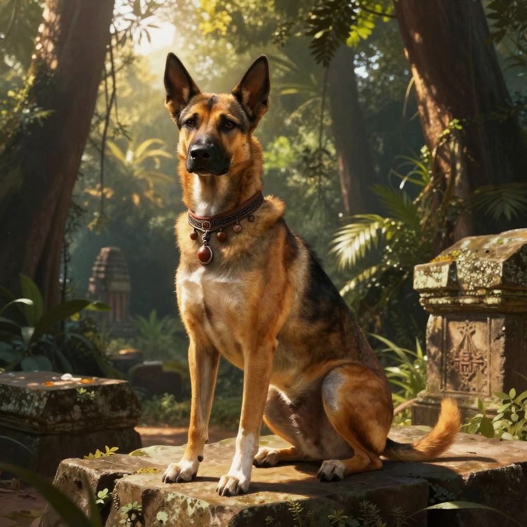A photograph of a German Shepherd dog sitting on a moss-covered stone in a sunlit, dense forest. The dog has a tan and black coat, erect ears, and a black collar with a red tag. Sunlight filters through the trees, casting dappled light on the dog and surrounding foliage. Ancient stone structures, including a partially visible stone urn, are positioned in the background. The forest is lush with greenery, including ferns and tall trees, creating a serene, mystical atmosphere. The image has a realistic, vibrant style.
