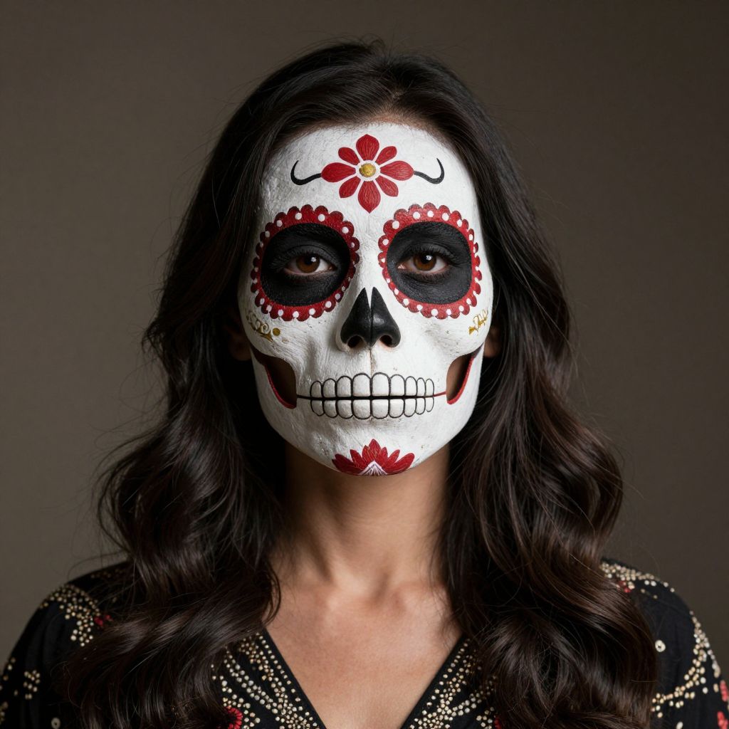 Photograph of a woman with black hair, white sugar skull face paint, red and yellow flower crown, red dress, and dangling earrings, standing outdoors