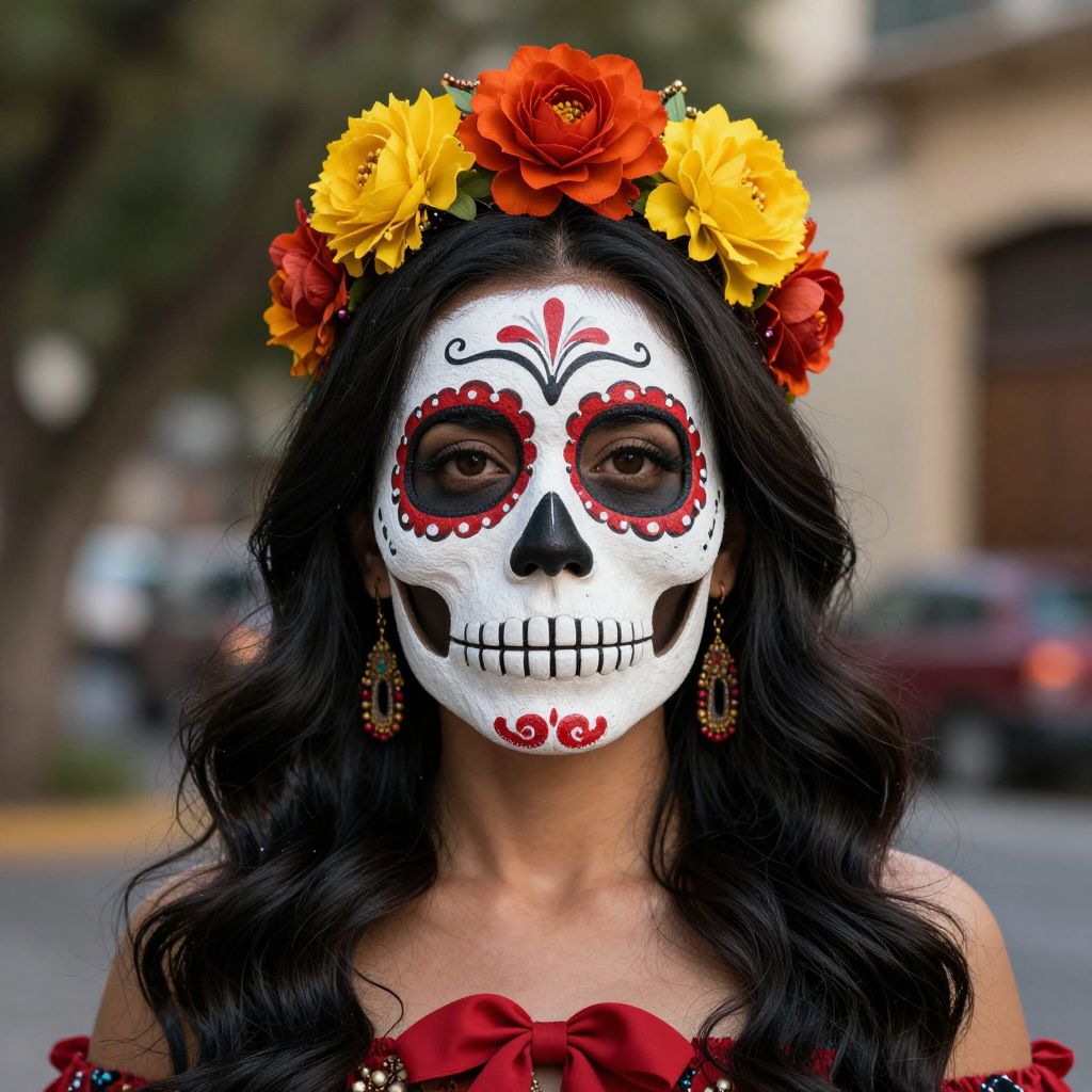 Photograph of a woman with long, wavy black hair, wearing a white sugar skull face mask adorned with red and black decorative patterns. She has a vibrant flower crown with red and yellow flowers and is wearing large, dangling gold earrings. Her off-the-shoulder red dress features a bow at the chest. The background is blurred, showing an outdoor urban setting with trees and buildings. The image has a vivid, colorful style, emphasizing the contrast between the white mask and the colorful flowers. The woman's eyes are dark and expressive behind the mask.