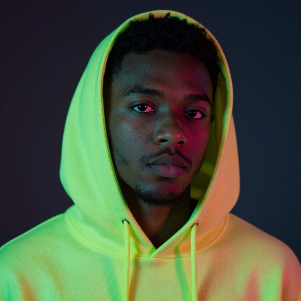 Neon clothes, 1boy, male focus, solo, black hair, hood, dark-skinned male, realistic, looking at viewer, facial hair, hoodie, dark skin, black eyes, upper body
