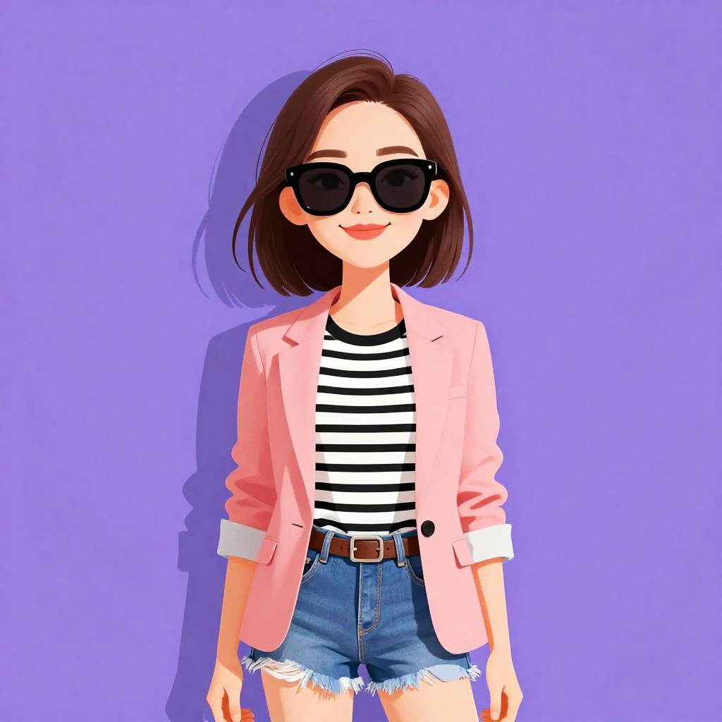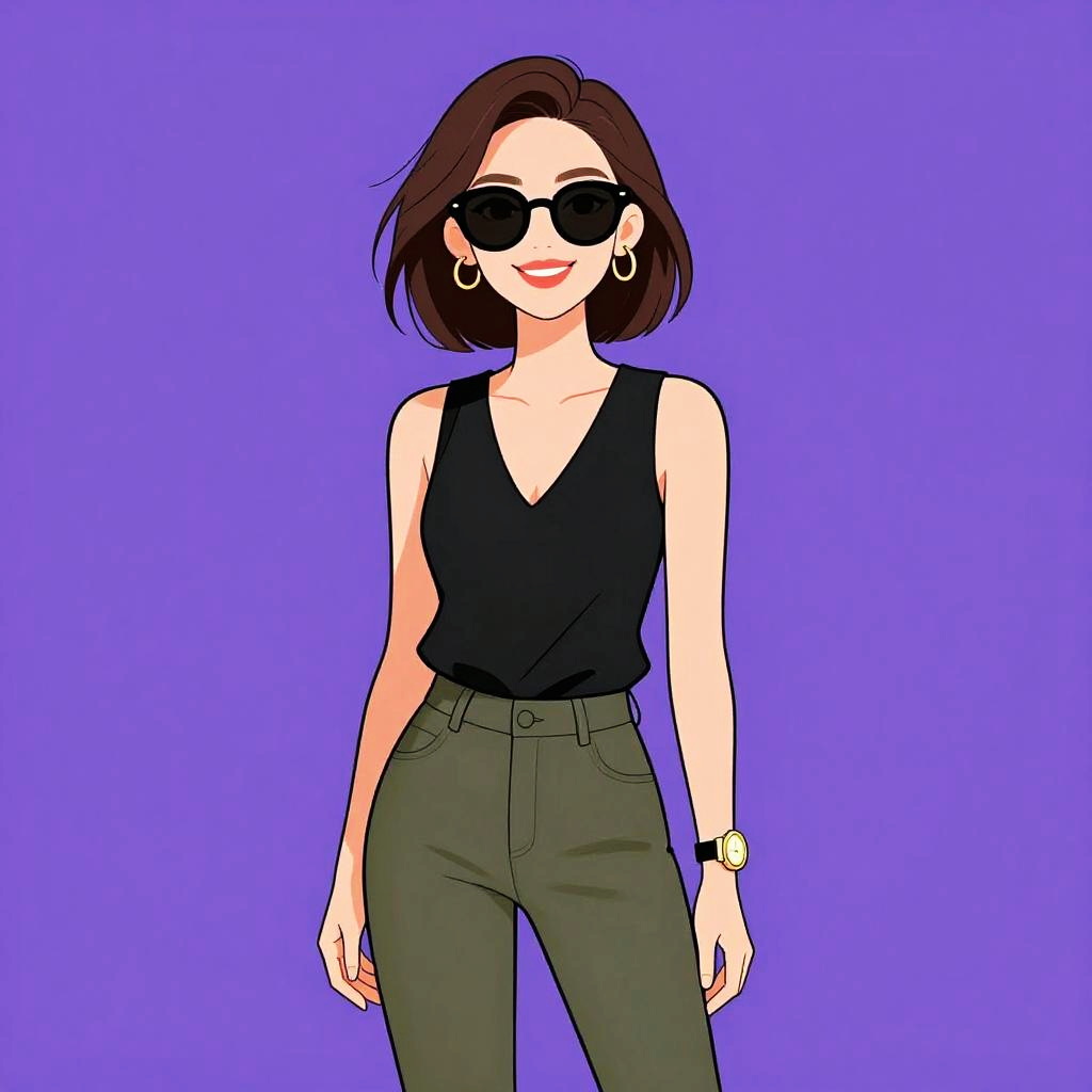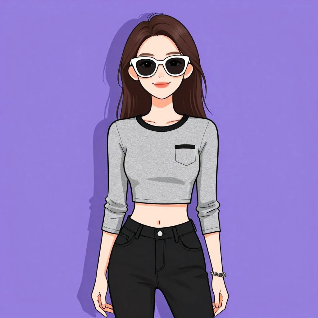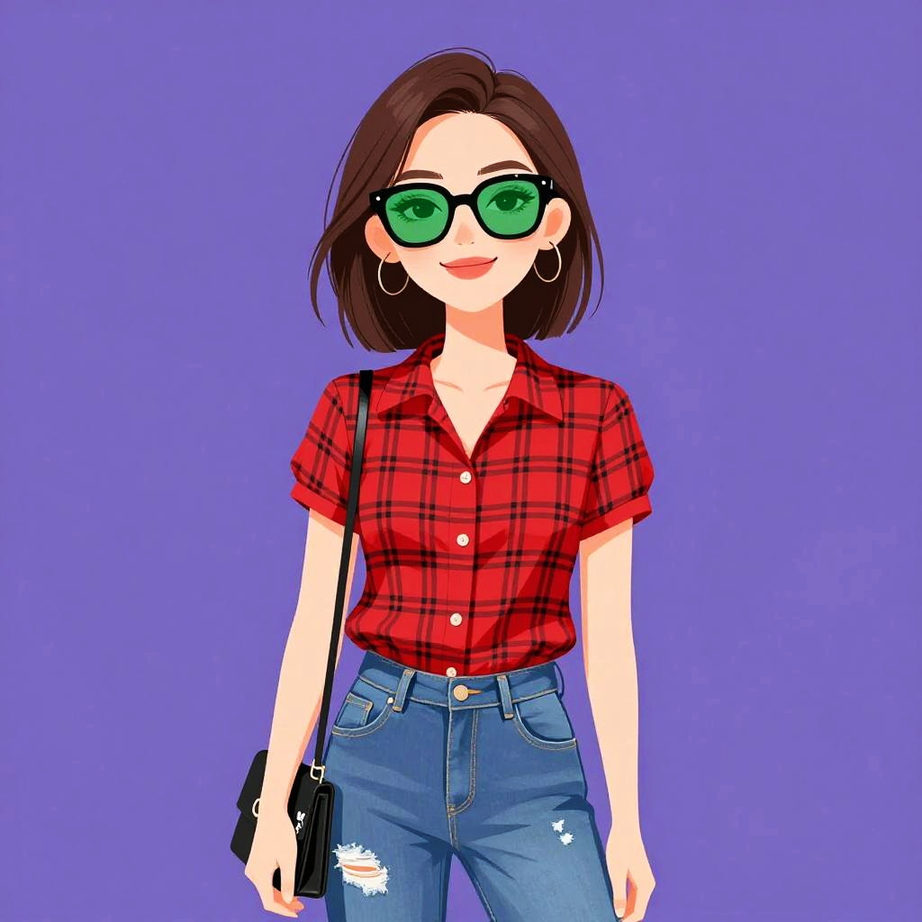 Woman with pretty face and pretty hair. Woman, casual, three-quarter sleeve raglan T-shirt with navy body and white sleeves, graphic print on the chest, light-washed distressed denim jeans, silver aviator sunglasses, layered bracelets on one wrist. --sref 1467