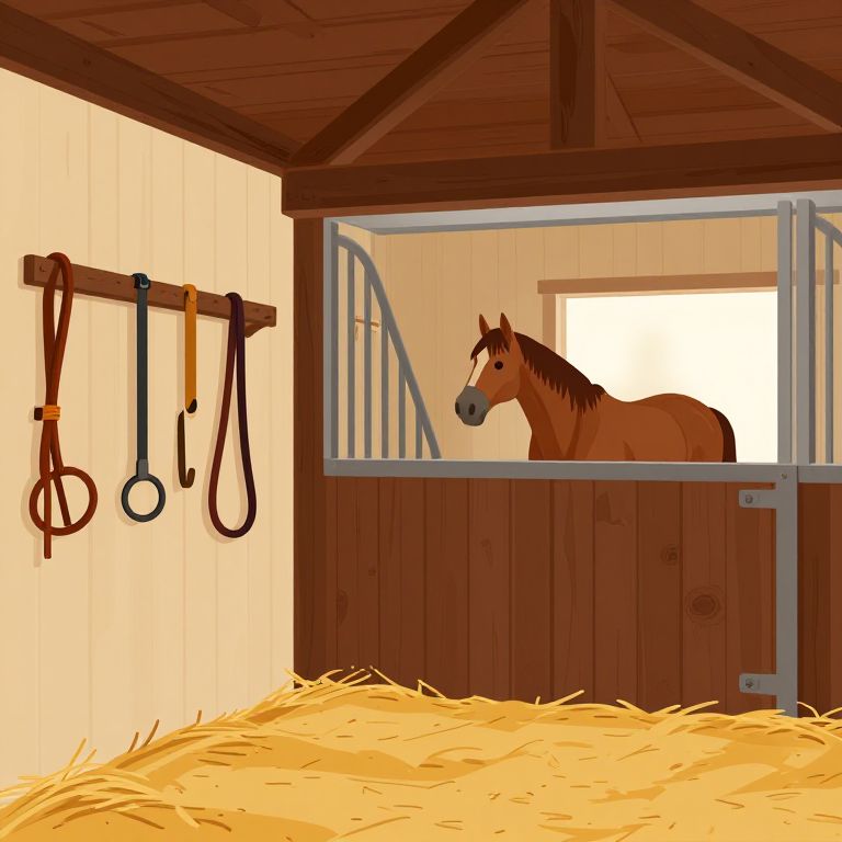 Digital illustration of a wooden stable with a brown horse standing in its stall, looking out. The stall has a metal gate and a window allowing sunlight to illuminate the horse's face. Hay covers the floor. On the left wall, three horse tack items—bridle, reins, and lead rope—hang from a wooden rod. The stable's walls are white with wooden paneling below, and the roof is wooden with visible beams. The overall color palette includes warm browns, yellows, and whites, giving a cozy, rustic feel.