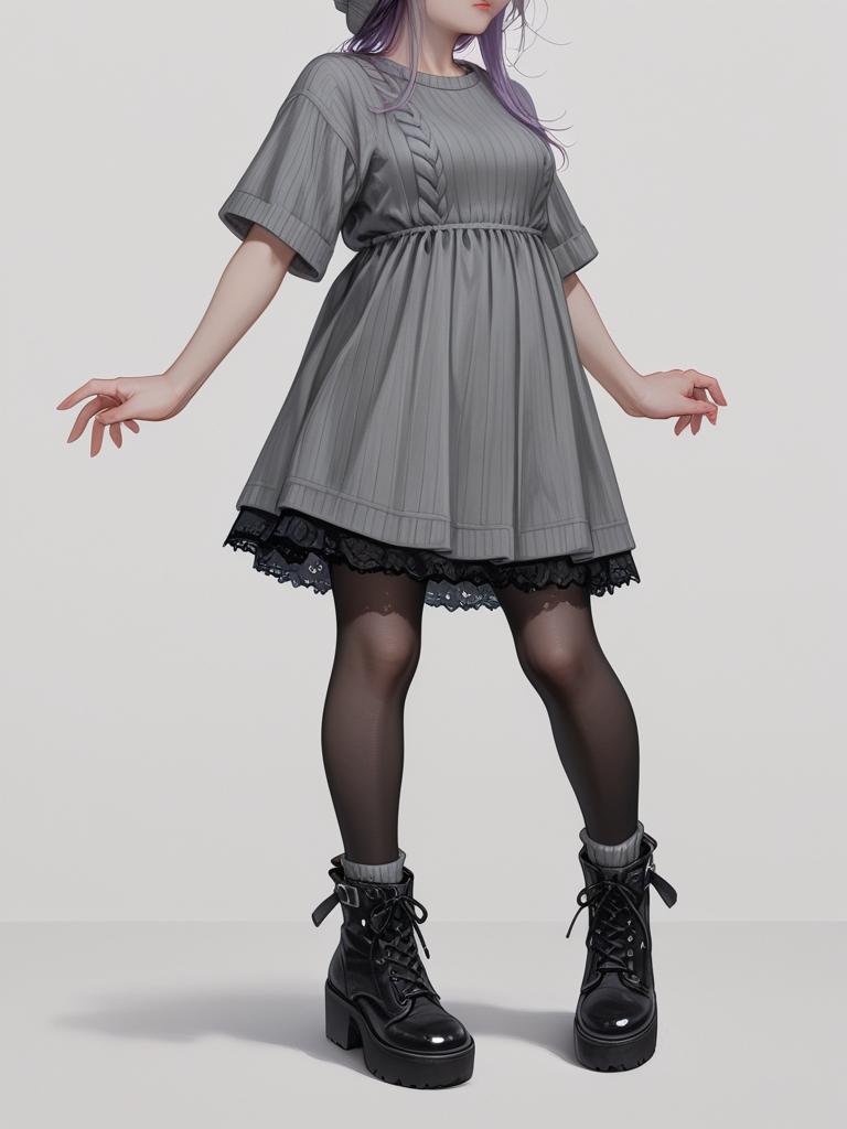 1girl, realistic face, full body shot, Woman, casual streetwear, ribbed short dress in lavender, short sleeves, crew neck, pleated texture, mini length, sheer black tights, black lace-up ankle boots, gray knitted beanie, white background