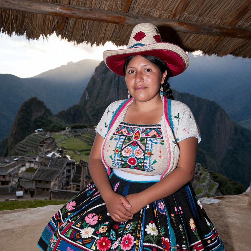 A candid, natural setting photo of a Peruvian Andean woman with deep brown skin, expressive facial features, and a serene expression, wearing an embroidered skirt with floral and geometric designs representing the Andean forests and valleys, and a handwoven bowler hat with a wide brim and red silk accents, sitting under a traditional thatched roof in a rural village near Machu Picchu, with sunrise glowing over the peaks.. The woman has big tits and cute face