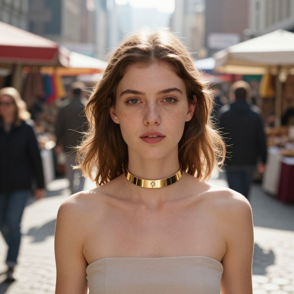 A candid-style photo of a young woman with light brown hair and freckles, wearing a polished gold choker with a tiny diamond-like accent, walking through a bustling city market in the morning, with colorful stalls and morning sunlight casting soft shadows on the cobblestone path.