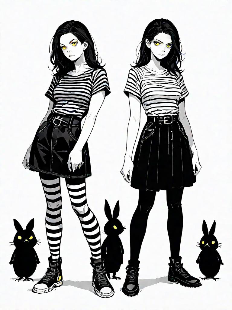 Digital art illustration of a young woman with yellow eyes in two poses. She wears a black and white striped t-shirt with short sleeves tucked into a high-waisted black mini skirt with a belt. The girl has black hair and sports trendy sneakers. Three black cartoon-like rabbits with glowing yellow eyes are positioned around her. The background is plain white.