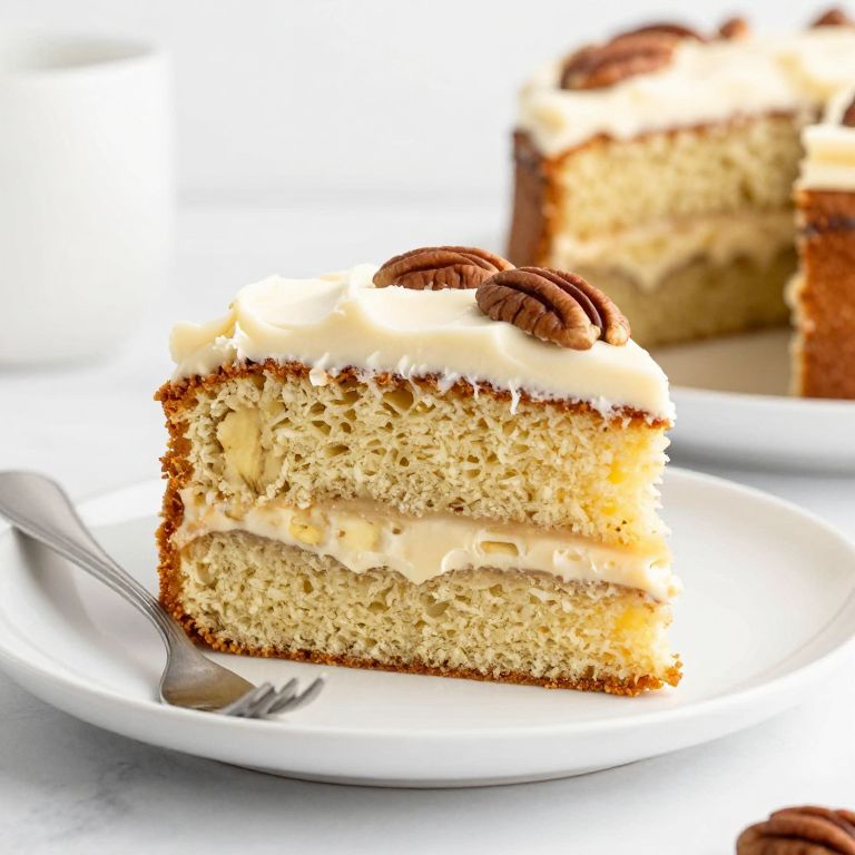 Slices of Hummingbird Cake, featuring layers of moist banana and pineapple sponge cake topped with creamy cream cheese frosting and garnished with whole pecans, presented on a white plate with a fork alongside, as seen on browneyedbaker.com.