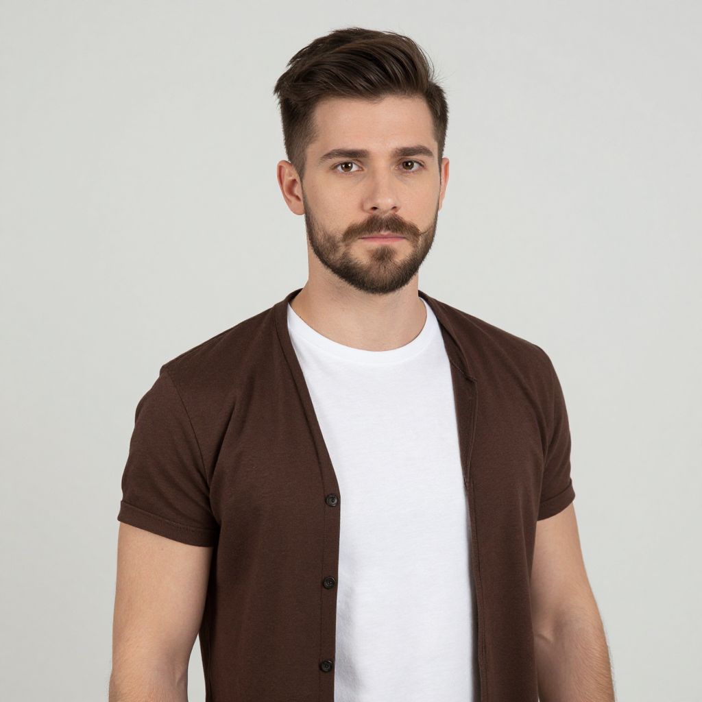 Ice cream man outfit costume, 1boy, male focus, solo, facial hair, looking at viewer, realistic, upper body, mustache, closed mouth, cosplay, beard, simple background
