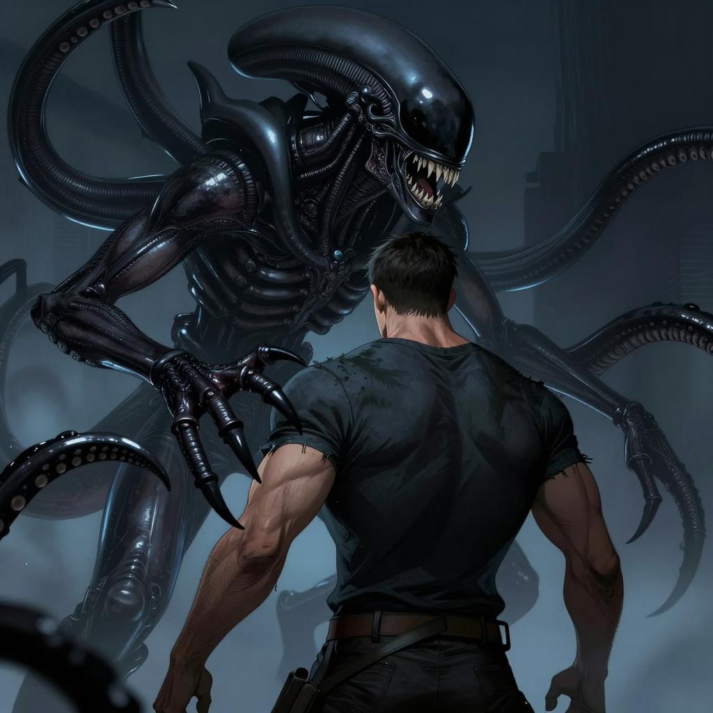 Dark, blue-tinted illustration of a muscular man with short hair, wearing a tattered shirt, facing a large, black, alien creature with numerous sharp, tentacle-like appendages. The creature's mouth is open, revealing a maw with sharp teeth. The man's back is to the viewer, with his head turned slightly to the right. The creature's tentacles are in the foreground, some touching the man's arm and chest. The scene is intense and dynamic.