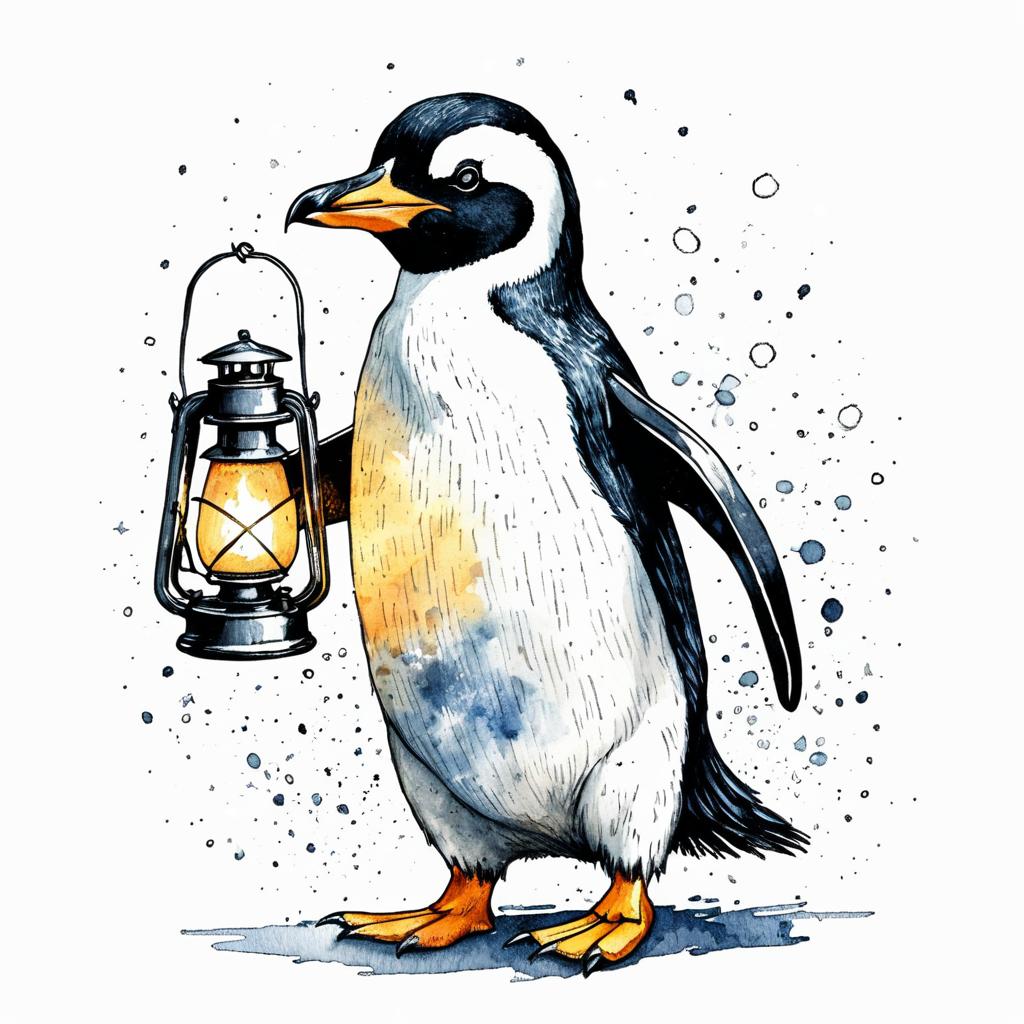 A whimsical illustration of penguin holding a lantern, hand-drawn cartoon style; dynamic, expressive linework, varied thickness; soft watercolor washes over detailed ink outlines, textured brushstrokes; fine cross-hatching and stippling techniques; isolated, white background