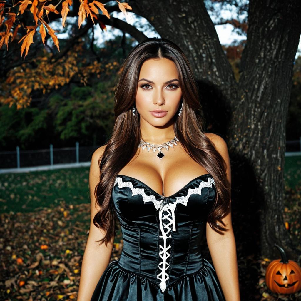 Portrait of a blonde woman wearing an off-shoulder black dress and black floral necklace, with a large orange rose hair ornament. She stands outdoors with carved jack-o'-lantern pumpkins and autumn trees in the background, evoking a Halloween theme.