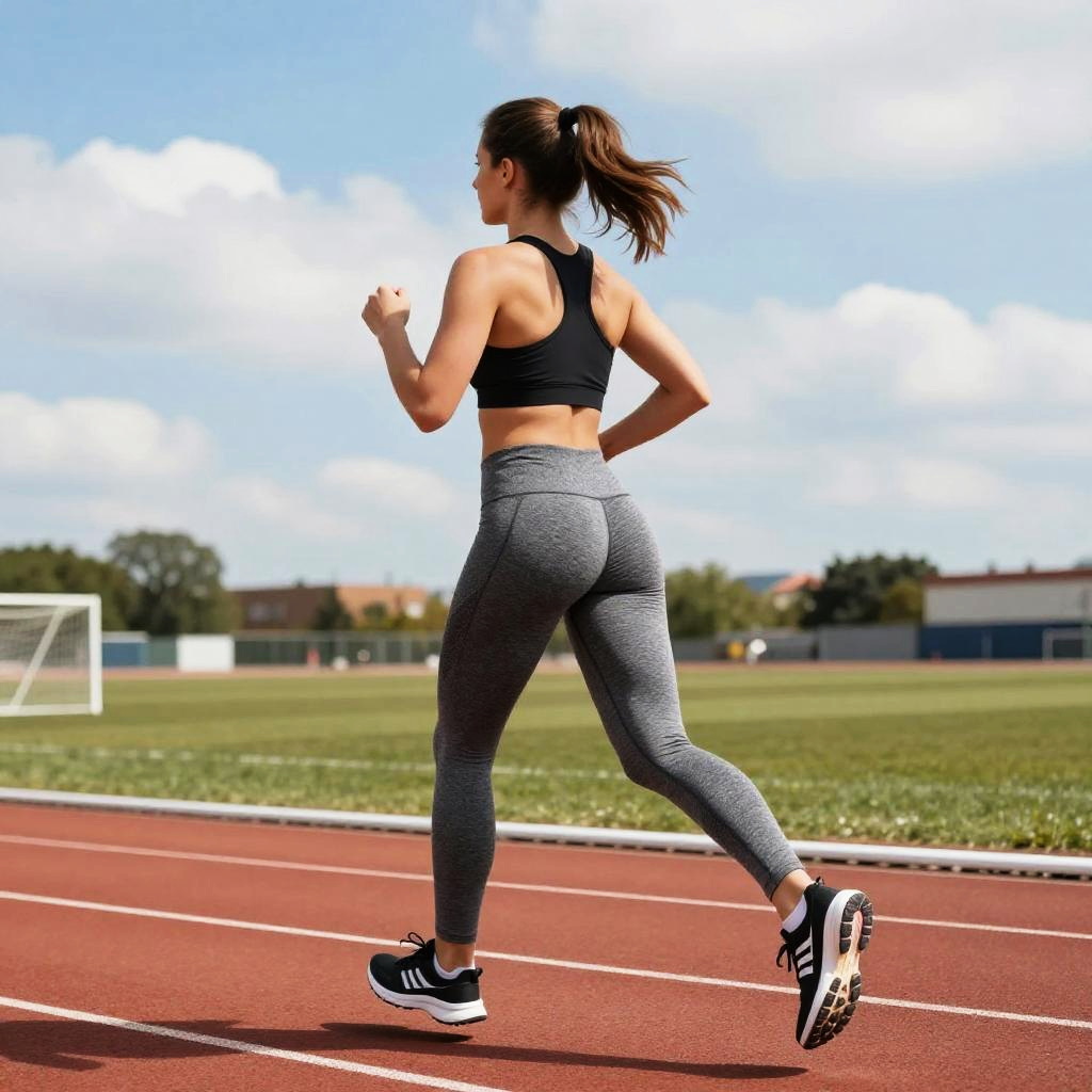 A photograph of a young woman with light skin and brown hair in a ponytail, wearing a black long-sleeve top and black leggings, bending forward with her hands on a red running track. She's wearing white sneakers and is positioned on a lane marked by white lines. The background shows blurred stadium seating and greenery under a clear blue sky.