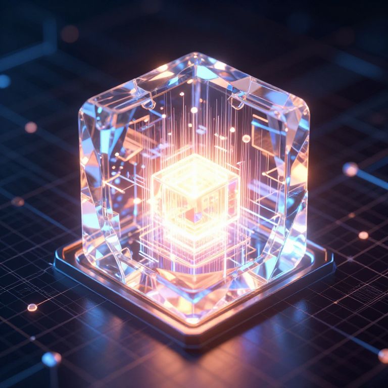 Photograph of a glowing, transparent, square crystal block illuminated from within, radiating bright white and blue light. The crystal is perfectly clear, showcasing intricate internal reflections and geometric lines. It sits on a black grid-like surface with small, faintly glowing dots scattered across the background. The overall scene has a futuristic, high-tech feel, with sharp contrasts between the dark background and the bright, luminous crystal. The image has a digital, CGI-like quality with precise, clean lines and vibrant, saturated colors.