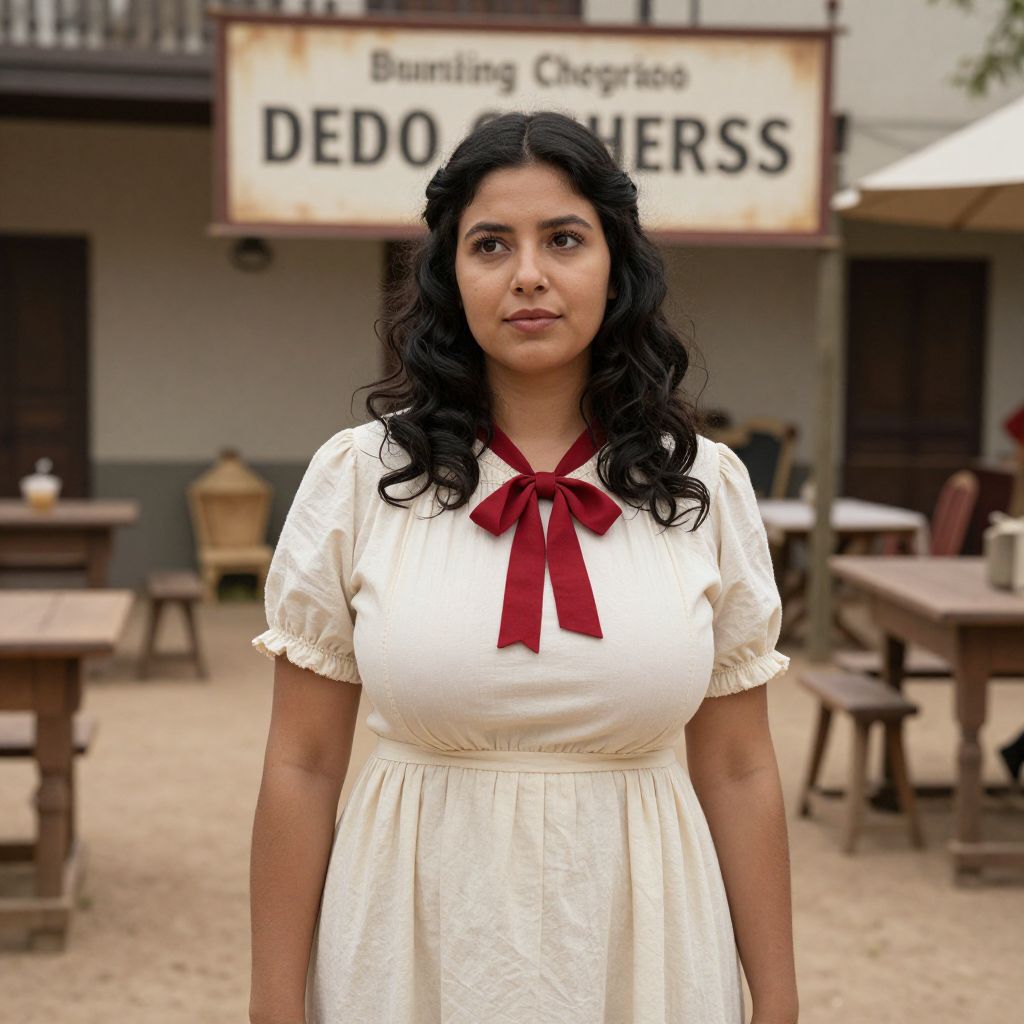A confident woman with dark wavy hair and a thoughtful expression wears a modest cotton frock dress in cream with a red bow, part of a vintage costume for a historical reenactment, standing in a dusty courtyard with old signage and wooden tables set up for a colonial-era festival.. The woman has big tits and cute face
