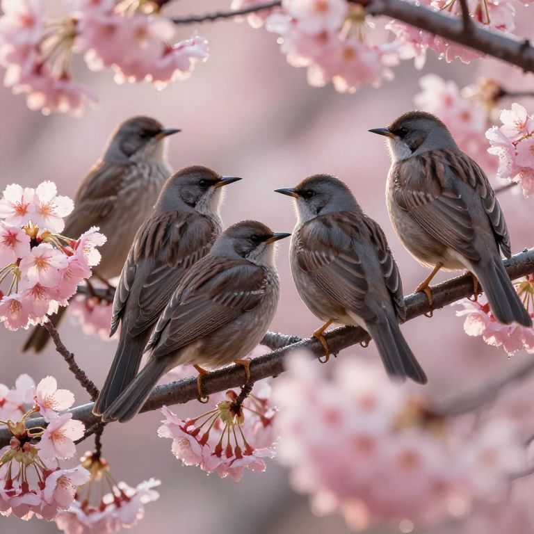 A flock of burds perched on blooming cherry blossom branches, delicate pink flowers surrounding them, morning dew on petals, high detail feathers with subtle color variations, warm sunlight filtering through, serene and peaceful atmosphere