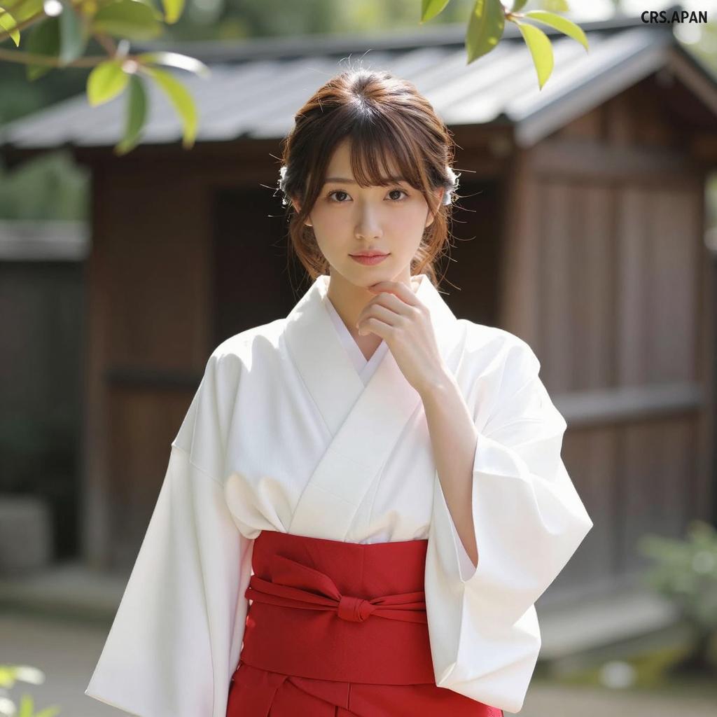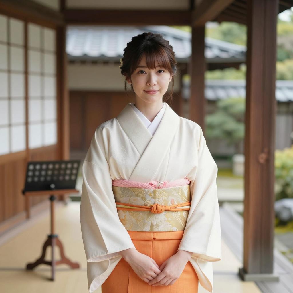 Asian woman with long brown hair in a ponytail, wearing a white kimono and orange hakama, holding a bamboo staff. She stands outdoors with blurred bamboo in the background. She smiles slightly, looking directly at the camera. "CK-JAPAN" on the left.