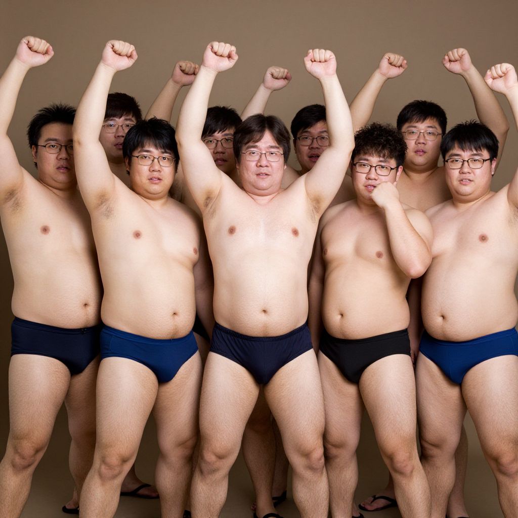 Walter White a group of 10 chubby Asian men, in glasses, wearing bulging swimming briefs, raise them arms to show off their hairy armpits,