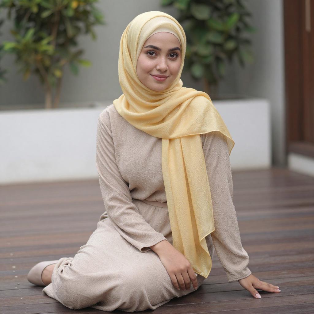 Photograph of a young woman with light skin and brown eyes, wearing a golden-yellow hijab and a shimmering, long-sleeved, beige dress. She is kneeling on a wooden deck, smiling softly. The background features blurred greenery and a white planter.