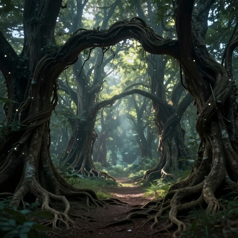 Photorealistic digital artwork of a mystical forest with a large, twisted tree archway, sunlight filtering through dense foliage, and a dirt path leading through