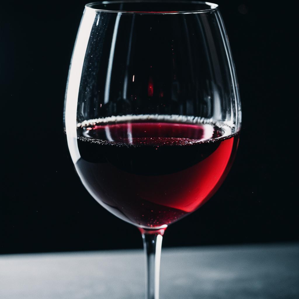 Photorealistic extreme close-up of a glass of red wine with rich ruby hues with glistening surface reflections. Captured with 35mm lens, f/1.8 aperture, showcasing a pro-level editorial style with ultra-realistic color grading and moody lighting.