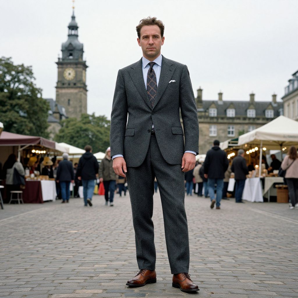 Photograph of a tall, white male with short, curly brown hair, standing in the center of a cobblestone market square. He wears a dark gray, pinstripe suit with a white dress shirt and a patterned tie, paired with brown leather dress shoes. His expression is serious. The background features blurred people walking, white market tents, and a historic building with a clock tower. The sky is overcast, casting a soft light over the scene. The image has a sharp focus on the man, with a shallow depth of field blurring the background.