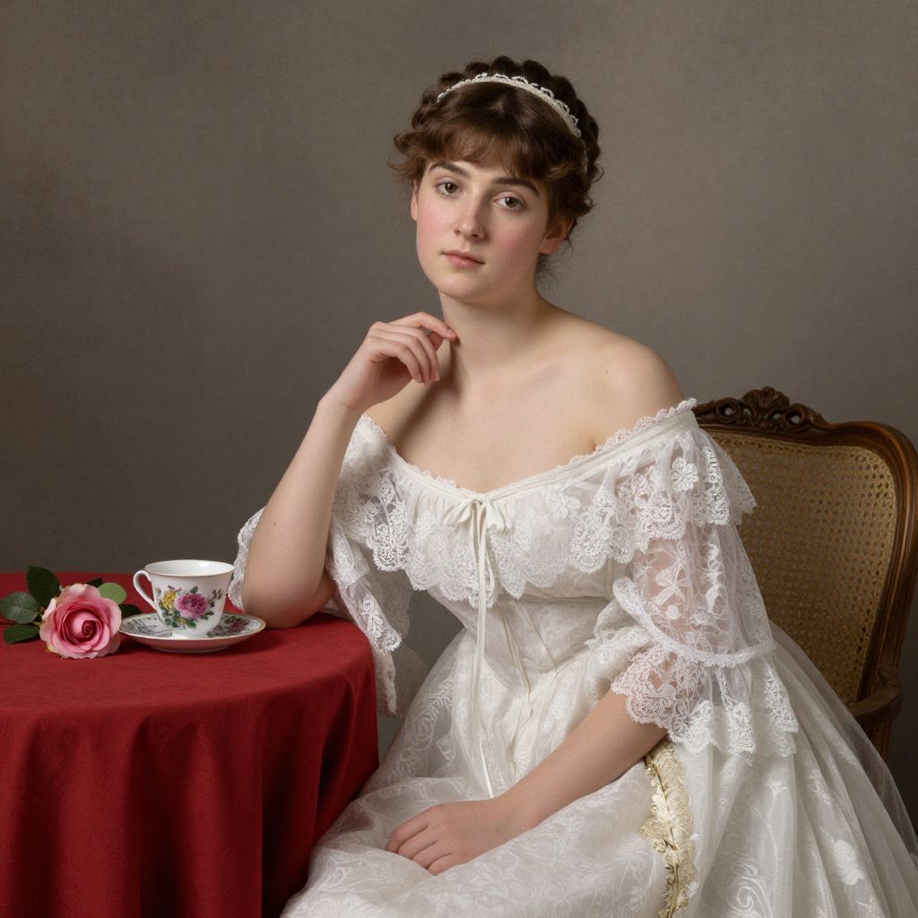 Elegant portrait of a young woman in a Victorian-style off-the-shoulder gown, adorned with lace details and a delicate headband, seated gracefully beside a red tablecloth featuring a single rose and a floral-patterned cup, captured by Konstantin Yegorovich Makovsky, a prominent Russian painter associated with the Peredvizhniki movement.