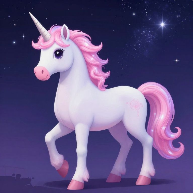 A radiant unicorn bathed in ethereal pink and purple hues stands gracefully against a starlit night sky, its flowing mane and tail shimmering like cosmic dust, defying the ordinary boundaries of reality.
