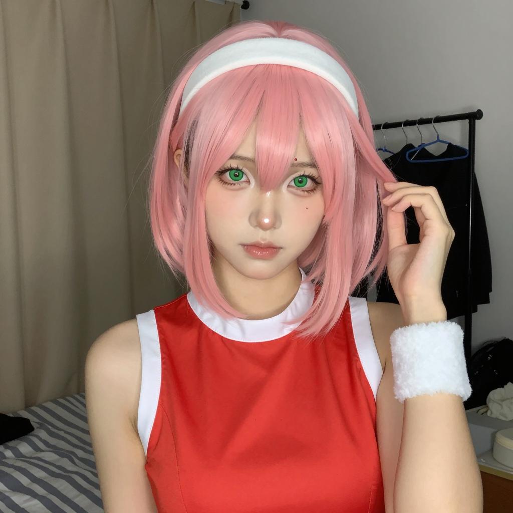 Young woman with light skin and pink bob haircut wearing a red sleeveless dress with white trim, headband, and white wristband. She has green eyes, a small red dot on her forehead, and looks directly at the camera with a neutral expression. Background includes beige curtains, black clothing on a rack, and a striped bed. Right hand touches her hair. Photographic style.