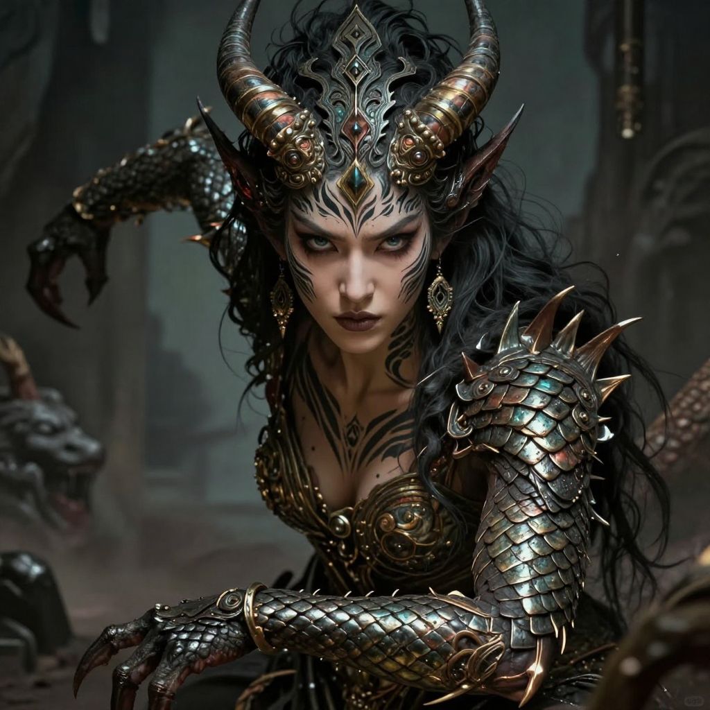 Female demon concept art, ancient mythological theme, elaborate tribal markings, fierce and captivating gaze, mystical environment, detailed scales and claws, atmospheric shading