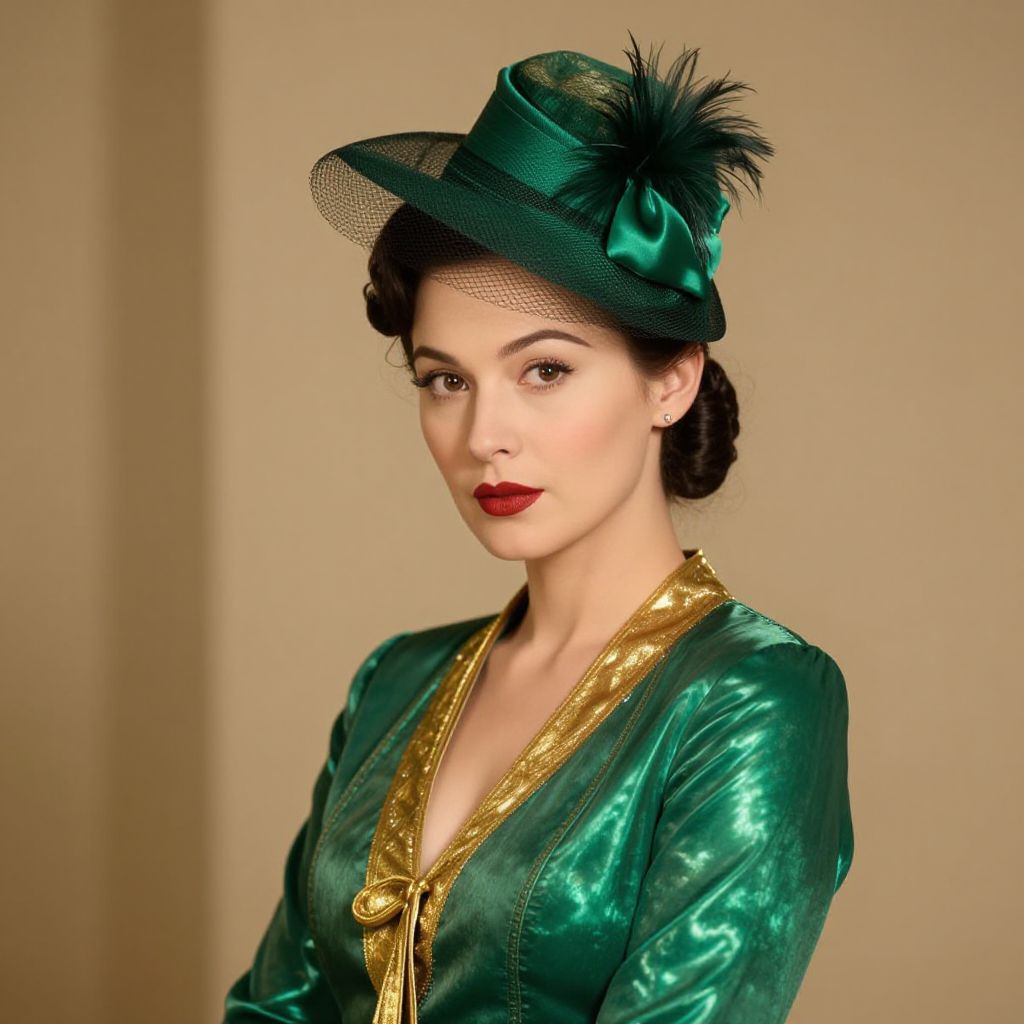 This captivating image features a woman elegantly dressed in a glossy green costume with gold accents, complemented by a stylish green hat. The sophisticated attire exudes a vintage charm, reminiscent of classic film aesthetics.