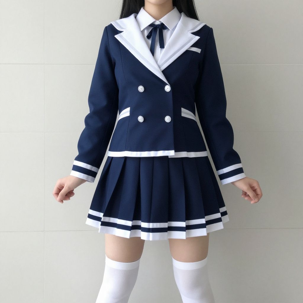 Photograph of an Asian woman wearing a black and white Japanese schoolgirl uniform with double-breasted jacket, pleated skirt, white thigh-high socks,