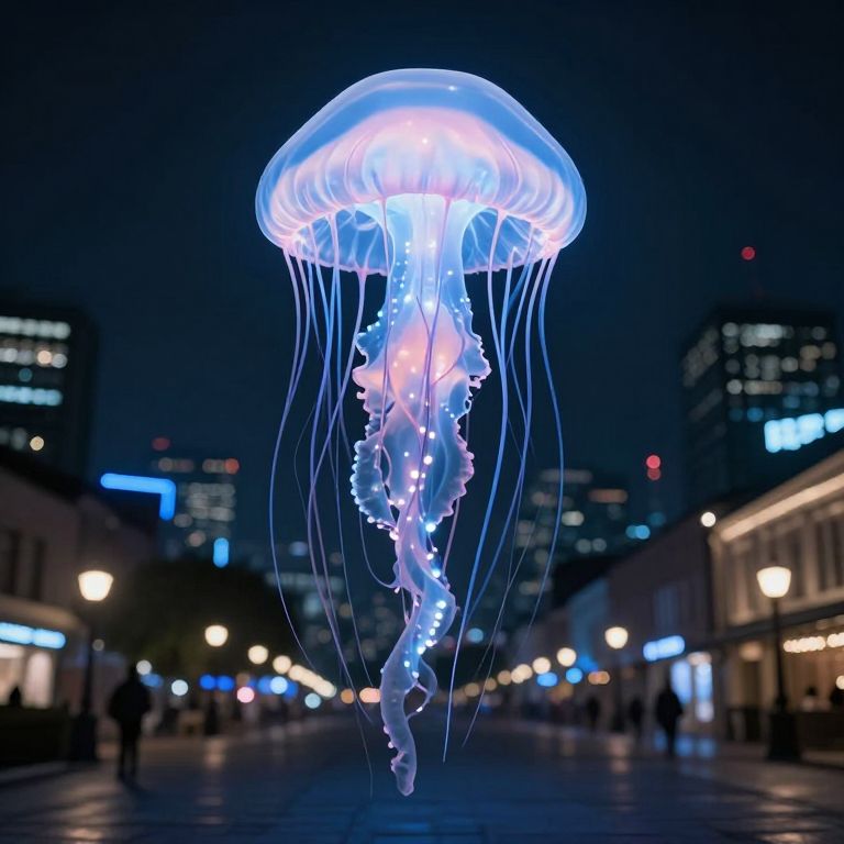 A colossal bioluminescent jellyfish hovers serenely above a bustling city plaza, its ethereal glow and cascading tentacles transforming the night into a surreal dreamscape.