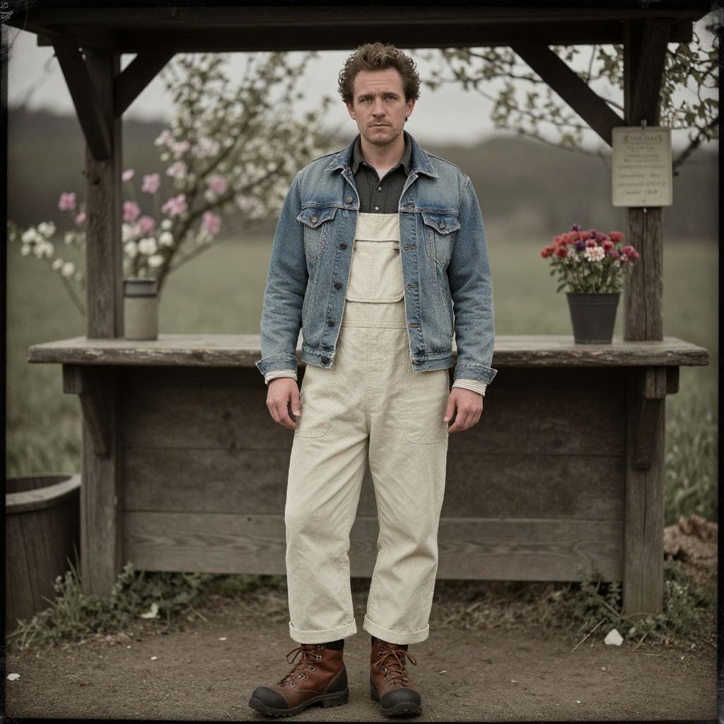 Photograph of a Caucasian man with short, curly brown hair and a light beard, standing outdoors in front of a wooden gazebo. He wears a blue denim jacket over a black button-up shirt and cream-colored overalls, with brown lace-up boots. The gazebo has a weathered wooden table with two potted flowers, one pink and one red, and a small sign. The background features a blurred, green, and gray landscape with trees and flowers. The image has a slightly muted, vintage color palette.