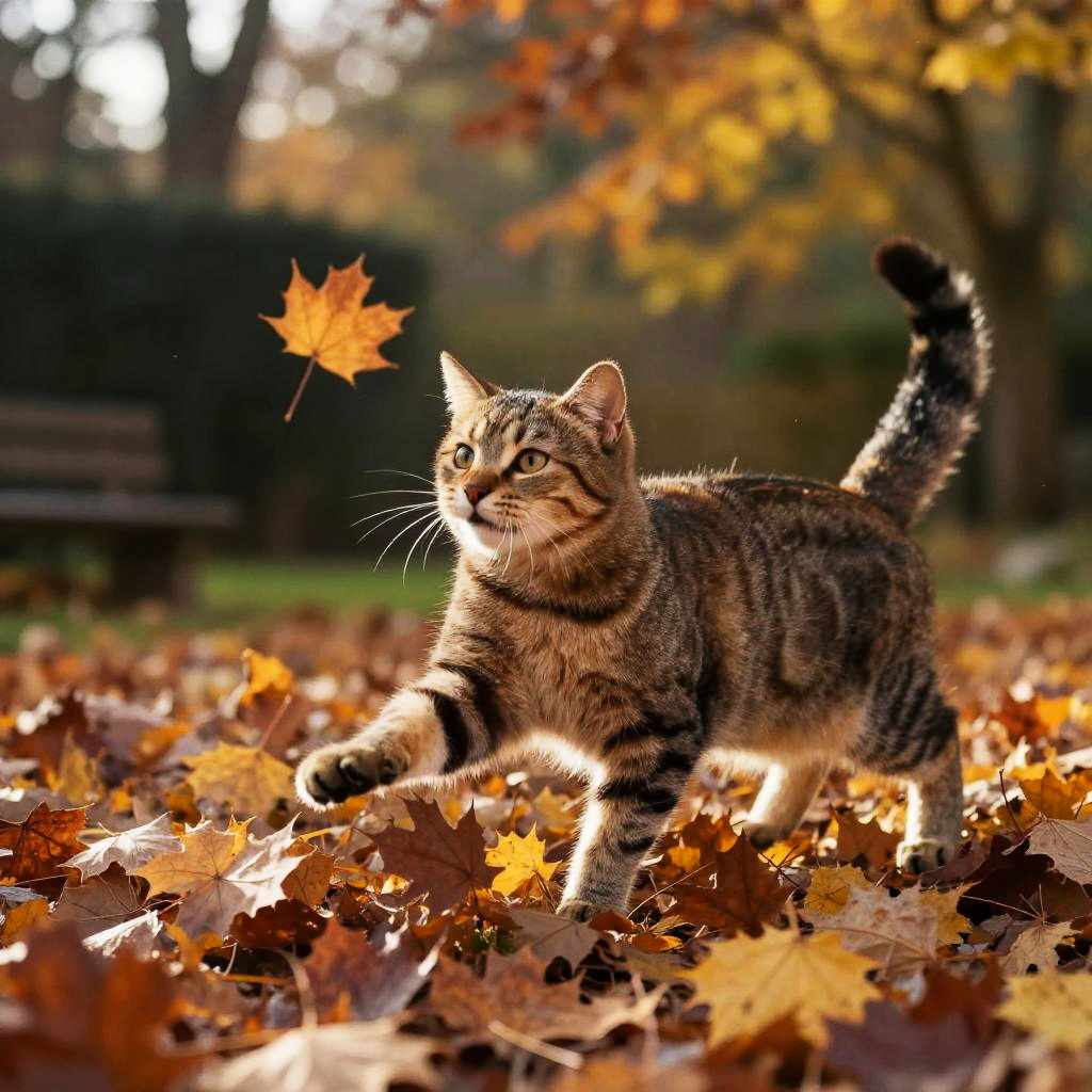 Fat cat eating Cheetos happily in a sunny garden, orange dust glowing on its fur, playful orange butterflies fluttering around, hyper-realistic details of the cat's glossy fur and snack crumbs.