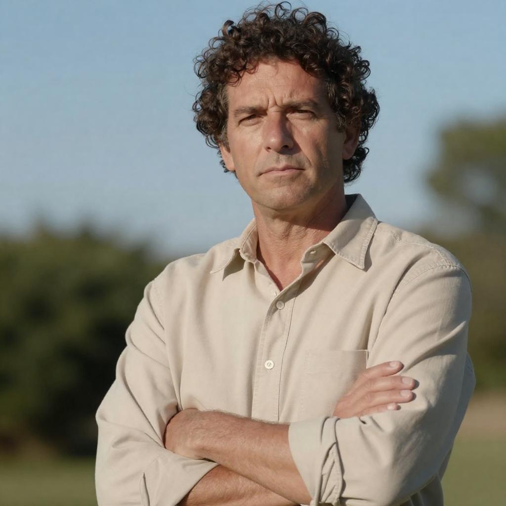 Photograph of a middle-aged man with curly brown hair and a serious expression, standing outdoors with arms crossed. He wears a loose, beige, button-up shirt. The background features a bright blue sky, green bushes, and a tree. The lighting highlights his facial features and shirt ure.