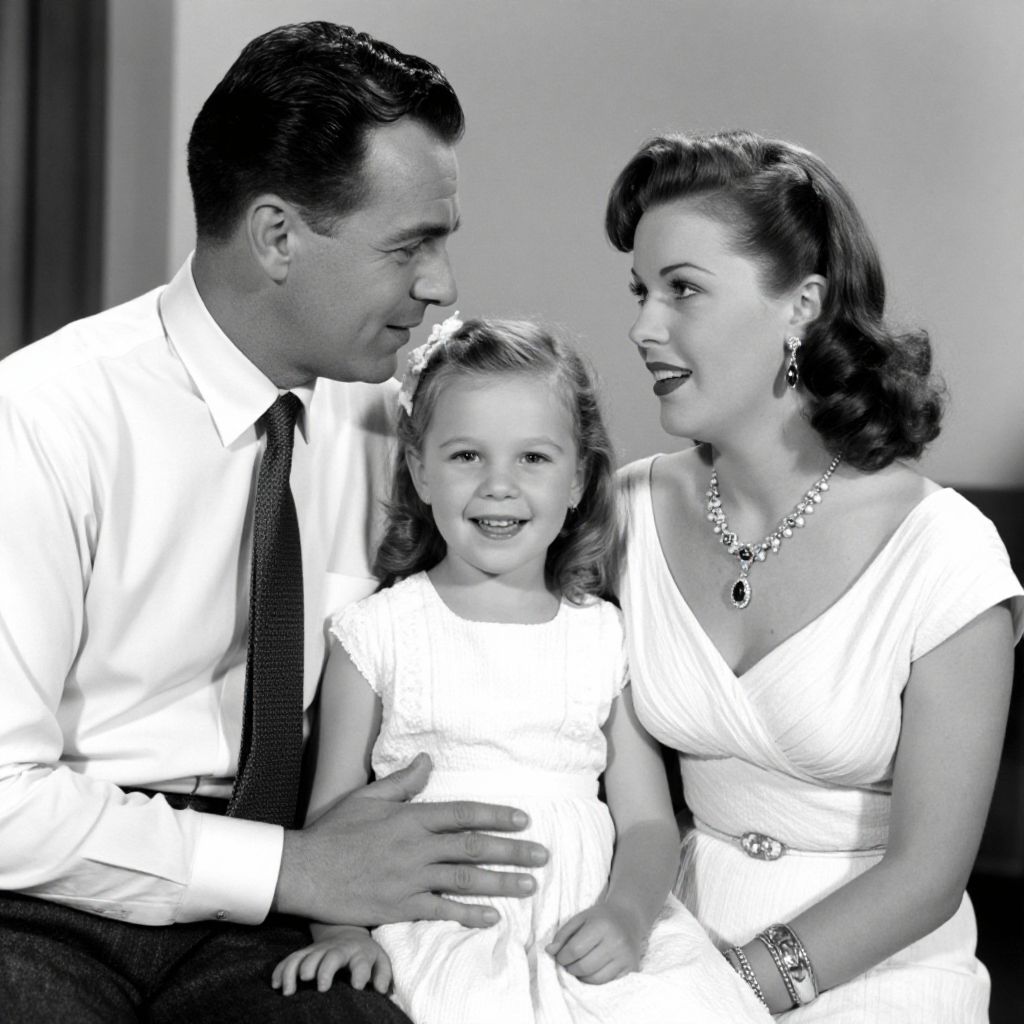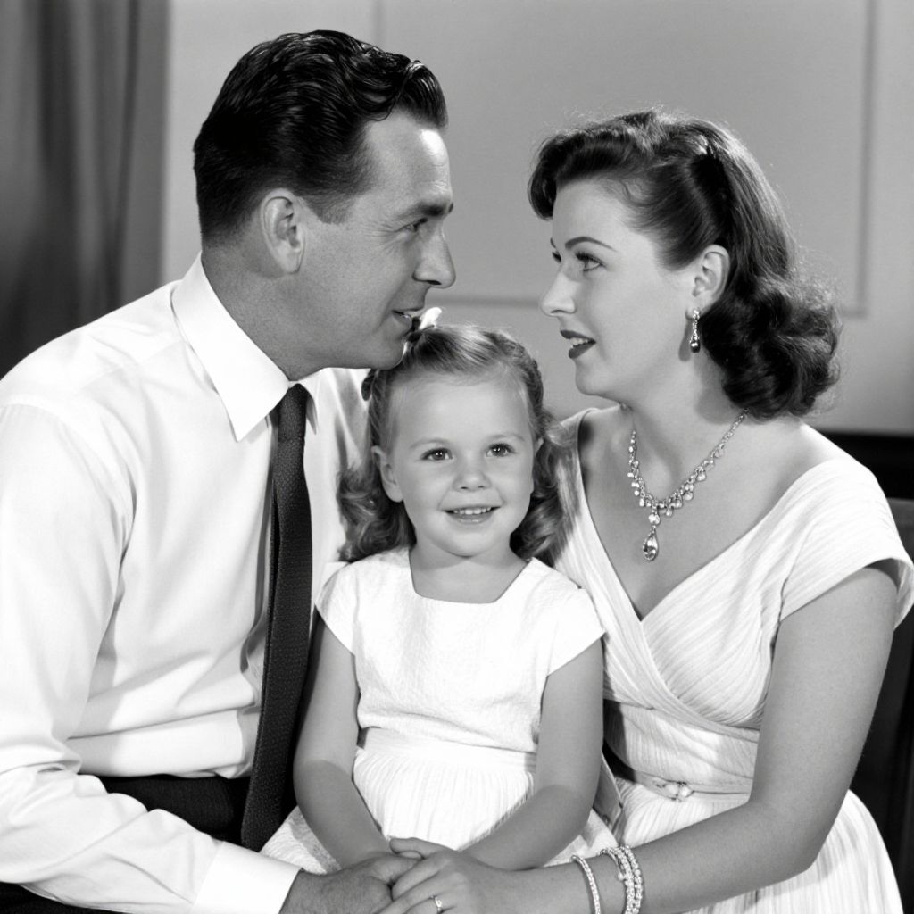 A black-and-white photograph capturing a vintage, retro aesthetic, featuring a family moment with a man in a crisp shirt and tie, a woman adorned in elegant jewelry and a white dress, and a smiling child in a white dress, all exuding a timeless, classic charm reminiscent of mid-20th-century Hollywood glamour.