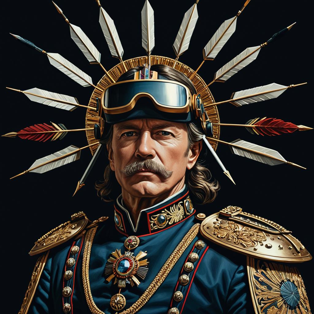 Digital painting of General Custer depicted as a military cyborg wearing a VR headset and ornate baroque-style uniform adorned with gold details and amber jewels. The composition features numerous arrows arranged in a halo-like pattern behind his head, blending elements of sci-fi and historical portraiture with a hyper-detailed, chiaroscuro technique.