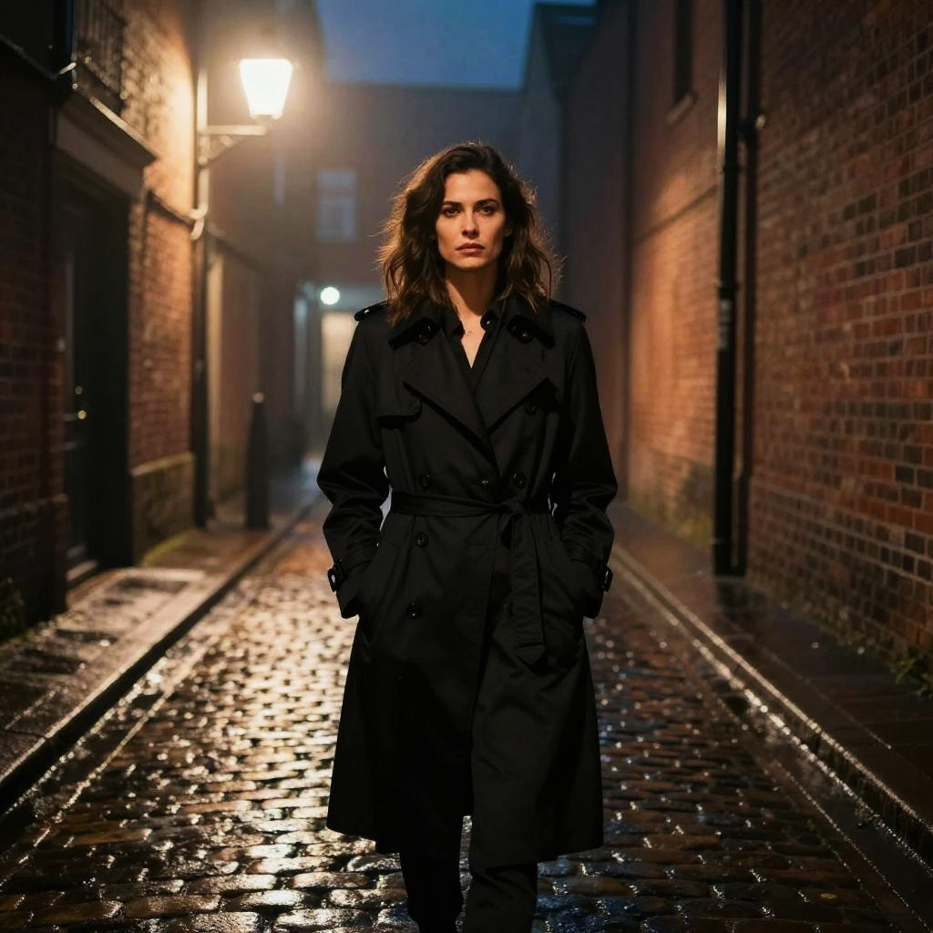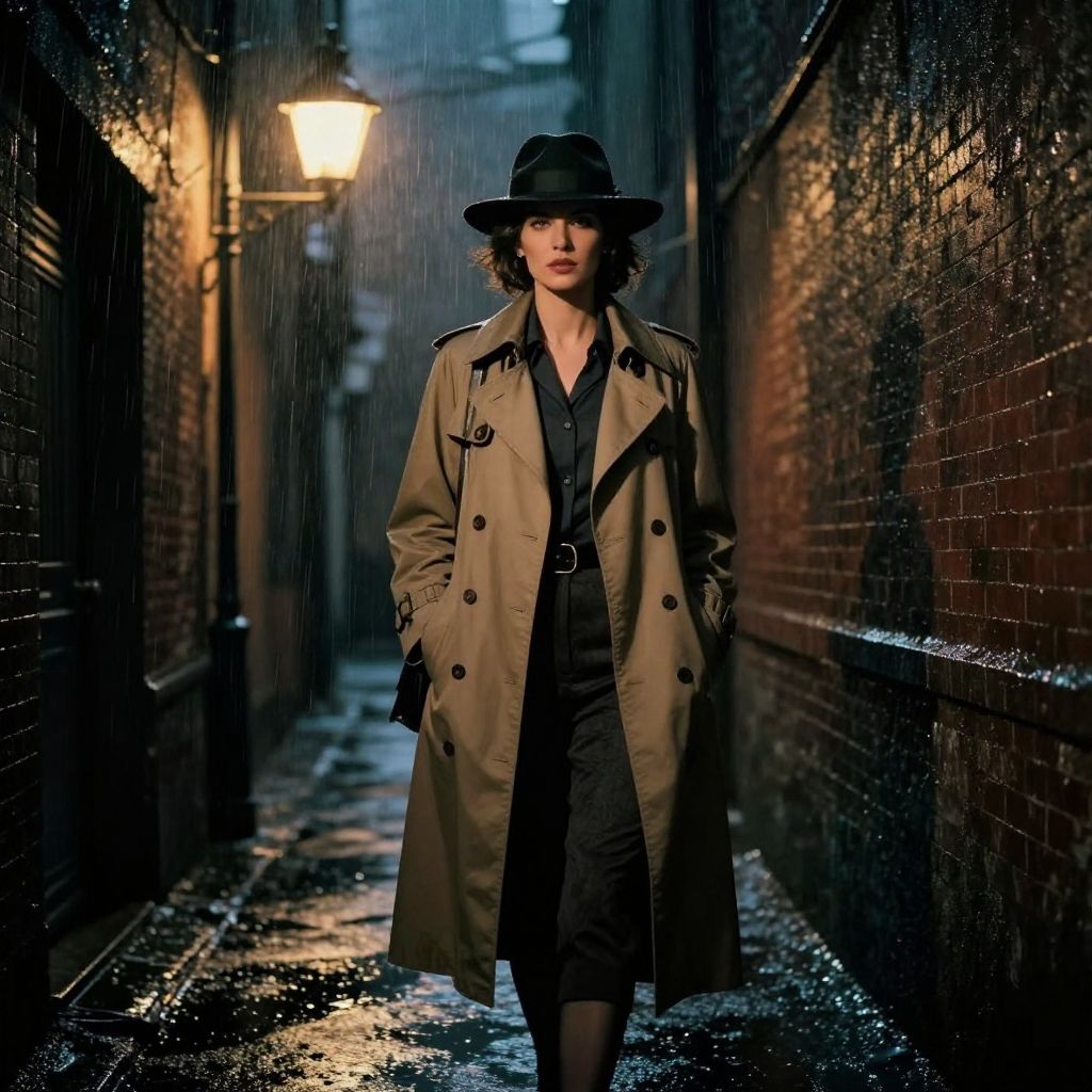 Female pulp art detective, rain-soaked dark alley, illuminated by flickering streetlamp, trench coat and fedora, moody shadows, classic noir vibe with dramatic contrast
