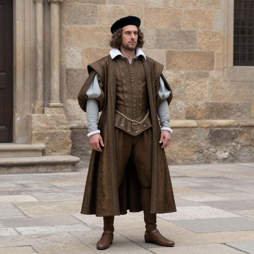 Spanish Renaissance Costume, man dressed in medieval clothing standing in front of a stone building