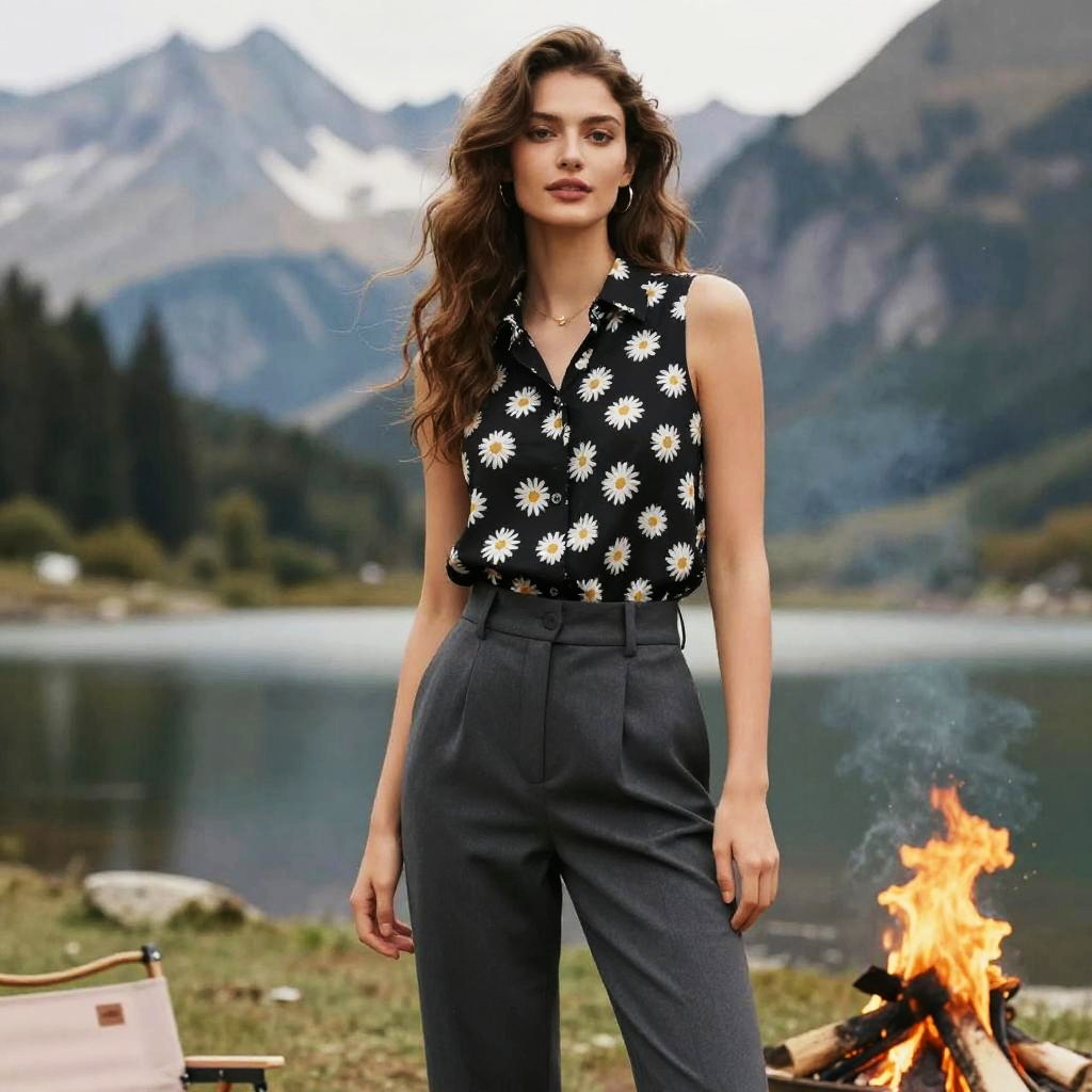 A tall woman in a casual chic outfit featuring a sleeveless black blouse with a daisy pattern and high-waisted charcoal grey trousers stands at a mountain lake with a campfire, her natural wavy hair flowing gently in the breeze. The scene captures a serene and inviting atmosphere, reminiscent of a wit studio visual style. Sexy. Pretty face and beutiful eyes