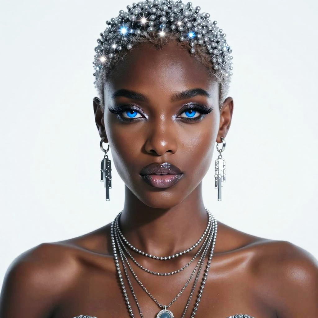 Blond ebony fusion, character with deep ebony skin and glowing blond streaks in hair, mystical atmosphere, dramatic lighting, fantasy digital art style