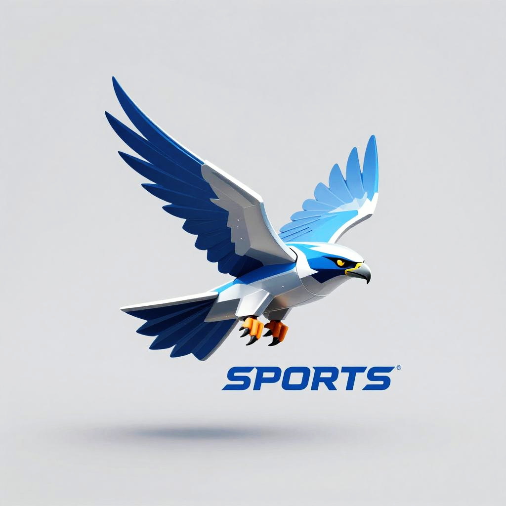 Digital illustration of a blue and white falcon in mid-flight with bold "SPORTS" text below, set against a white background.